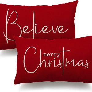Christmas Throw Pillow Covers 12x20 Inch Set of 2 Merry Christmas Farmhouse Decorations Believe Holiday Decor Throw Cushion Case for Home Couch |