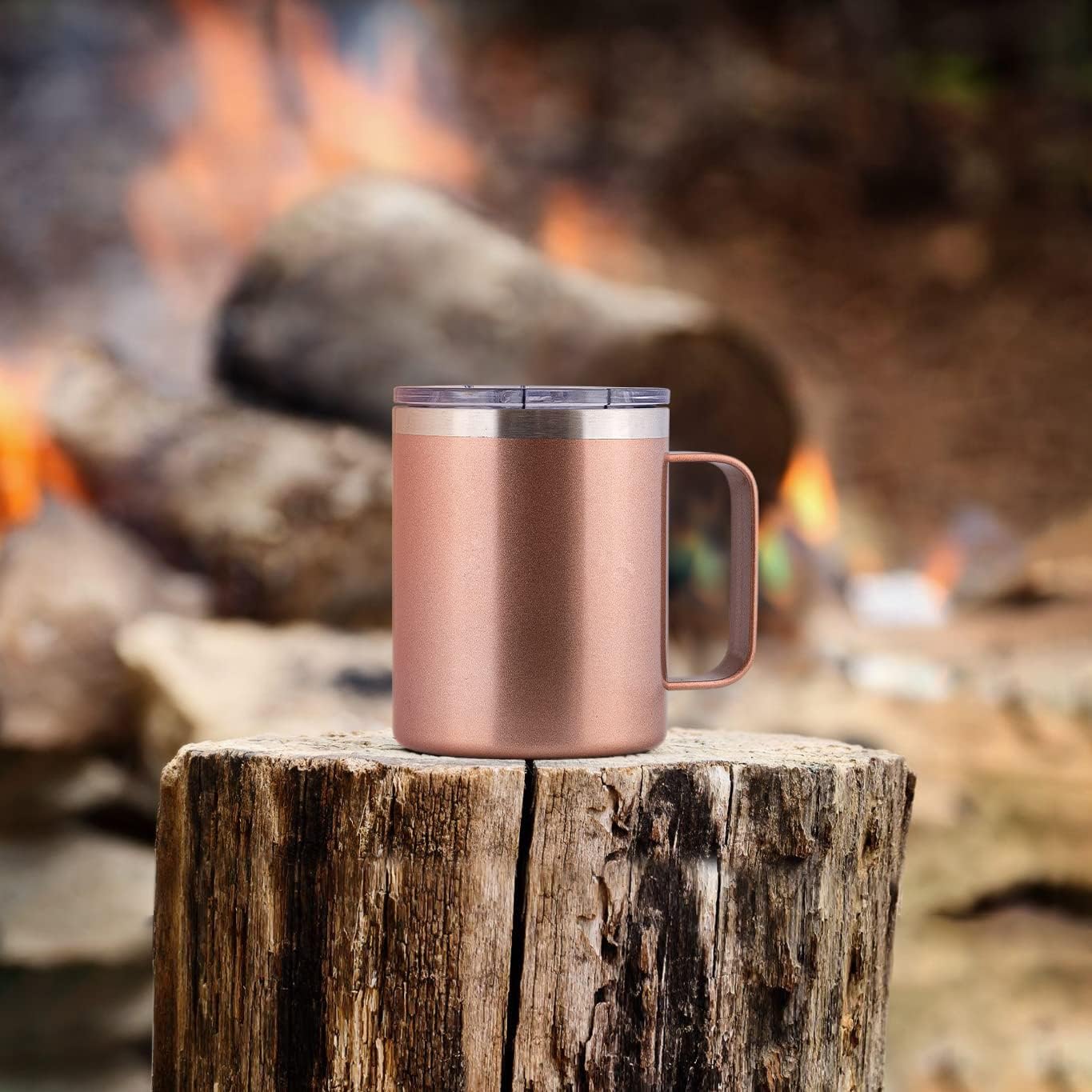 12 oz Insulated Coffee Mug with Lid - Stainless Steel Camping Mug Tumbler with Handle - Double Wall Vacuum Duracoated Insulated Mug For Travel, Camping, Office, Outdoor (Rose Gold)