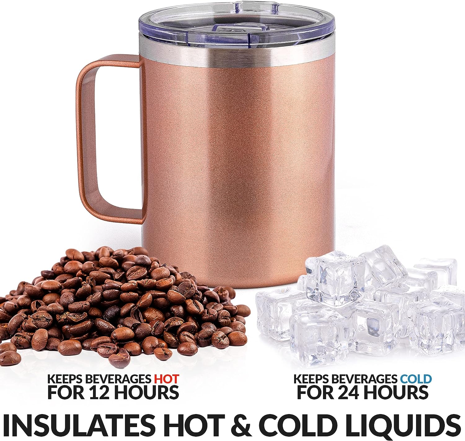 / 12 oz Insulated Coffee Mug with Lid – Stainless Steel Camping Mug Tumbler with Handle – Double Wall Vacuum Duracoated Insulated Mug For Travel, Camping, Office, Outdoor (Rose Gold)