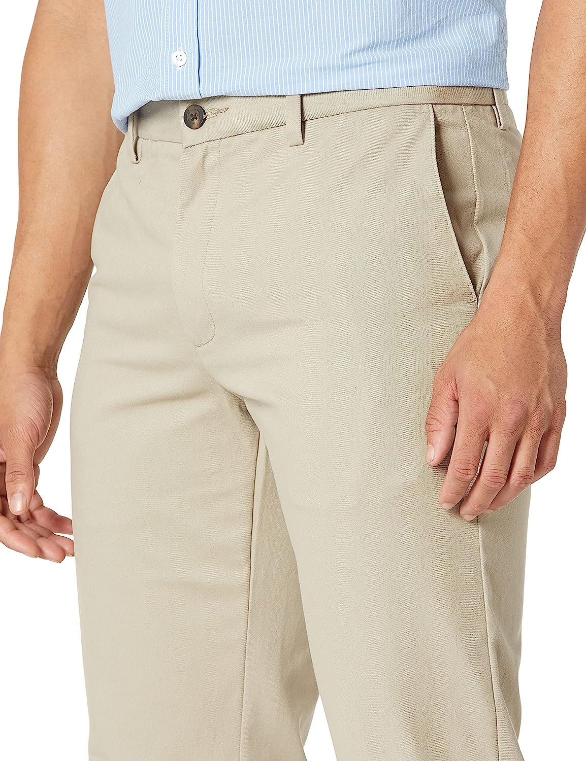 An Amazon brand – This slim-fit chino pant features wrinkle-free fabric, a flat-front design, and button-through back welt pockets for a tailored look and all-day comfort