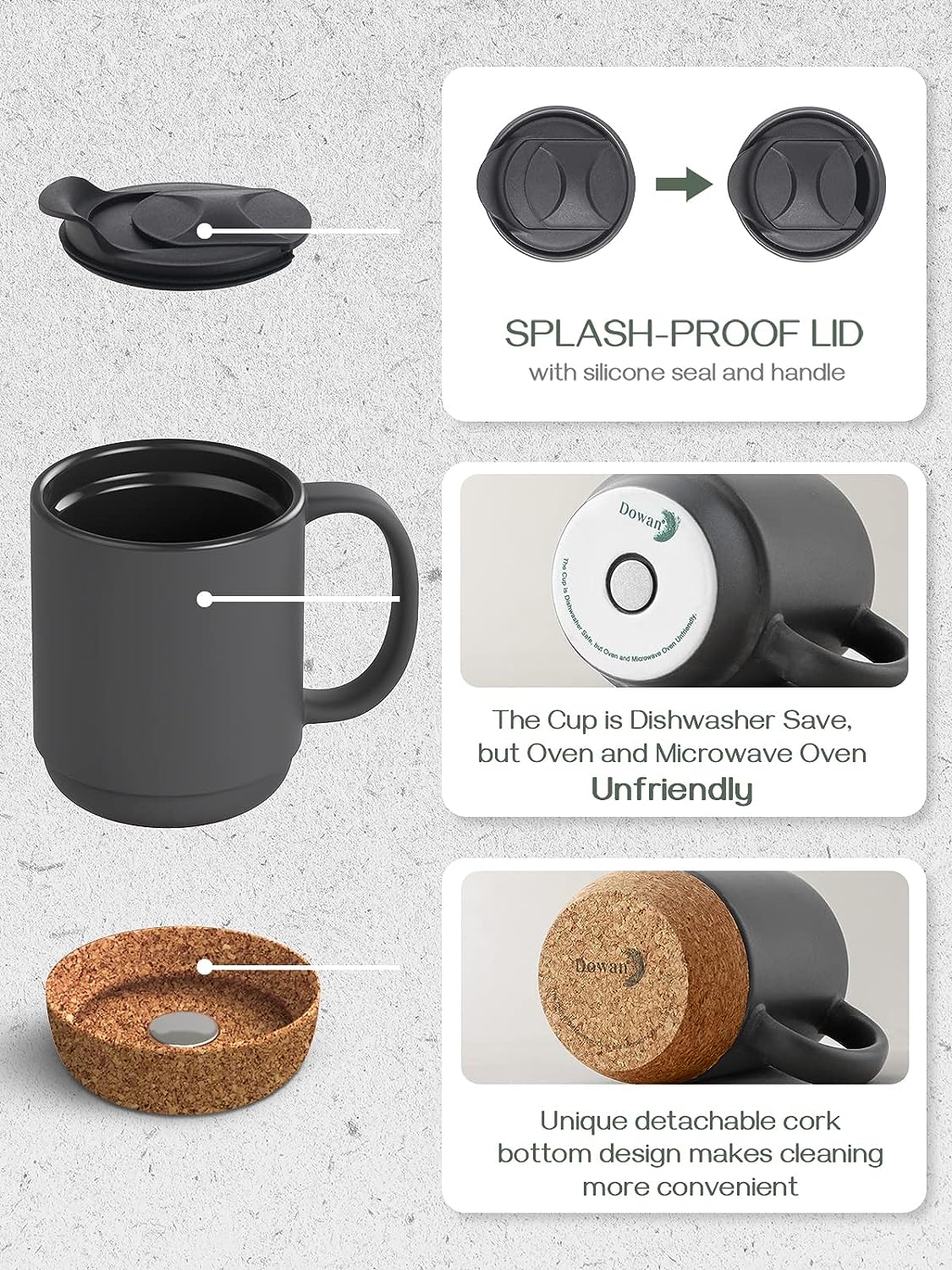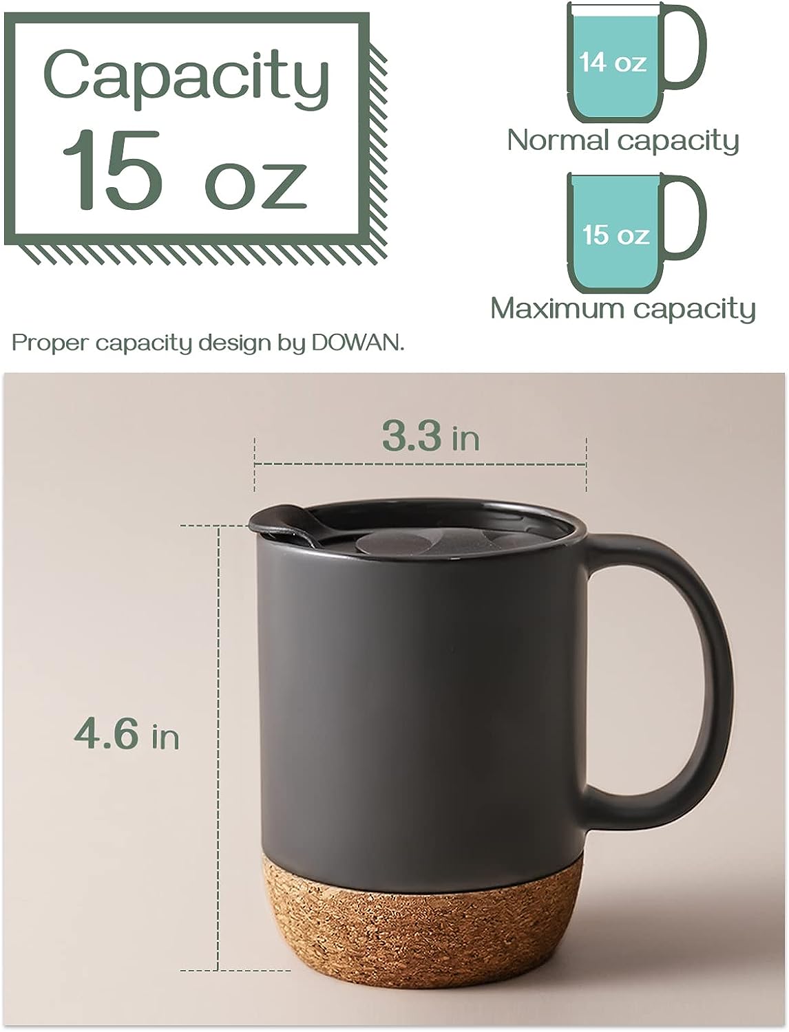 Coffee Mugs, 15 oz Mug Set of 2, Large Ceramic Coffee Mug with Cork Bottom and Spill Proof Lid for Men, Women, Big Mug for Coffee Latte, Tea, Gifts for Graduation, Matte Grey