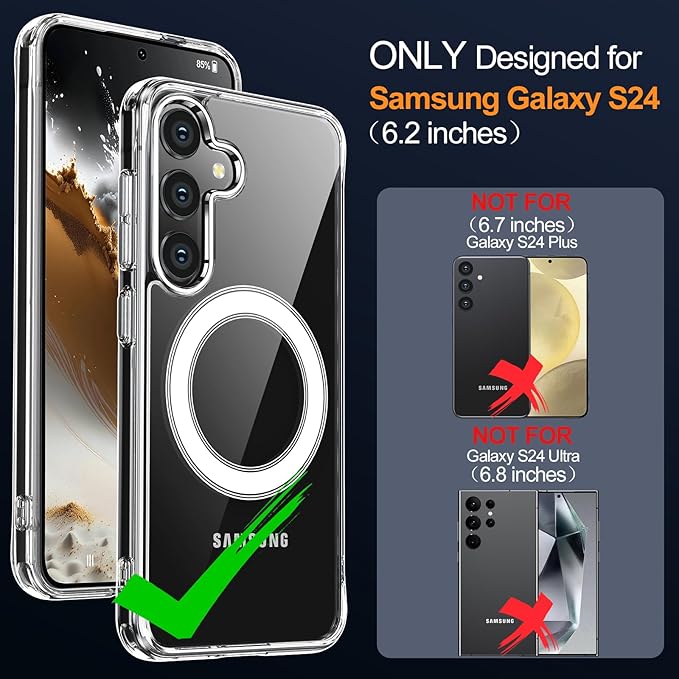 - [HD Clear & Never Yellow] Using high-grade Germany Bayer’s ultra-clear TPU material and Nano antioxidant layer, this Samsung Galaxy S24 clear case can block up 99.9% ultraviolet rays, stains, fingerprints and sweat effectively, keeping the longer-lasting clarity and never yellow over time,perfectly shows the original color of your phone.