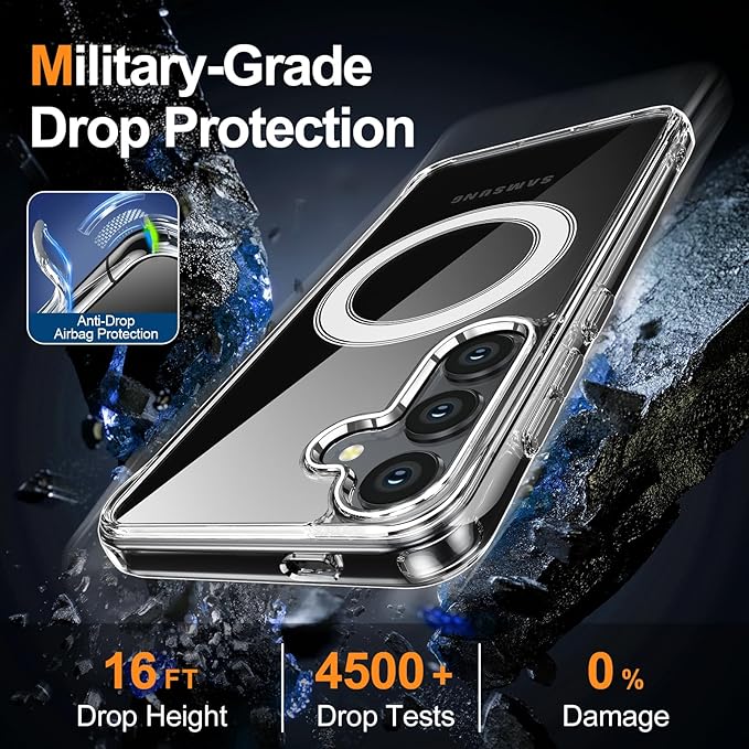 - [Upgraded Military-Grade Shockproof] Adopted with the durable hard PC back, soft TPU bumper and 4 built-in new upgraded shockproof airbags, this Galaxy S24 shockproof case is certified by the mil-standard and survived 4500+ drop tests up to 16 FT,which provide excellent cushioning to absorb the impact from any accidental fall.